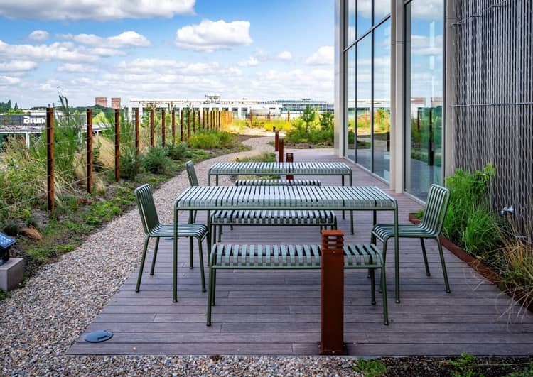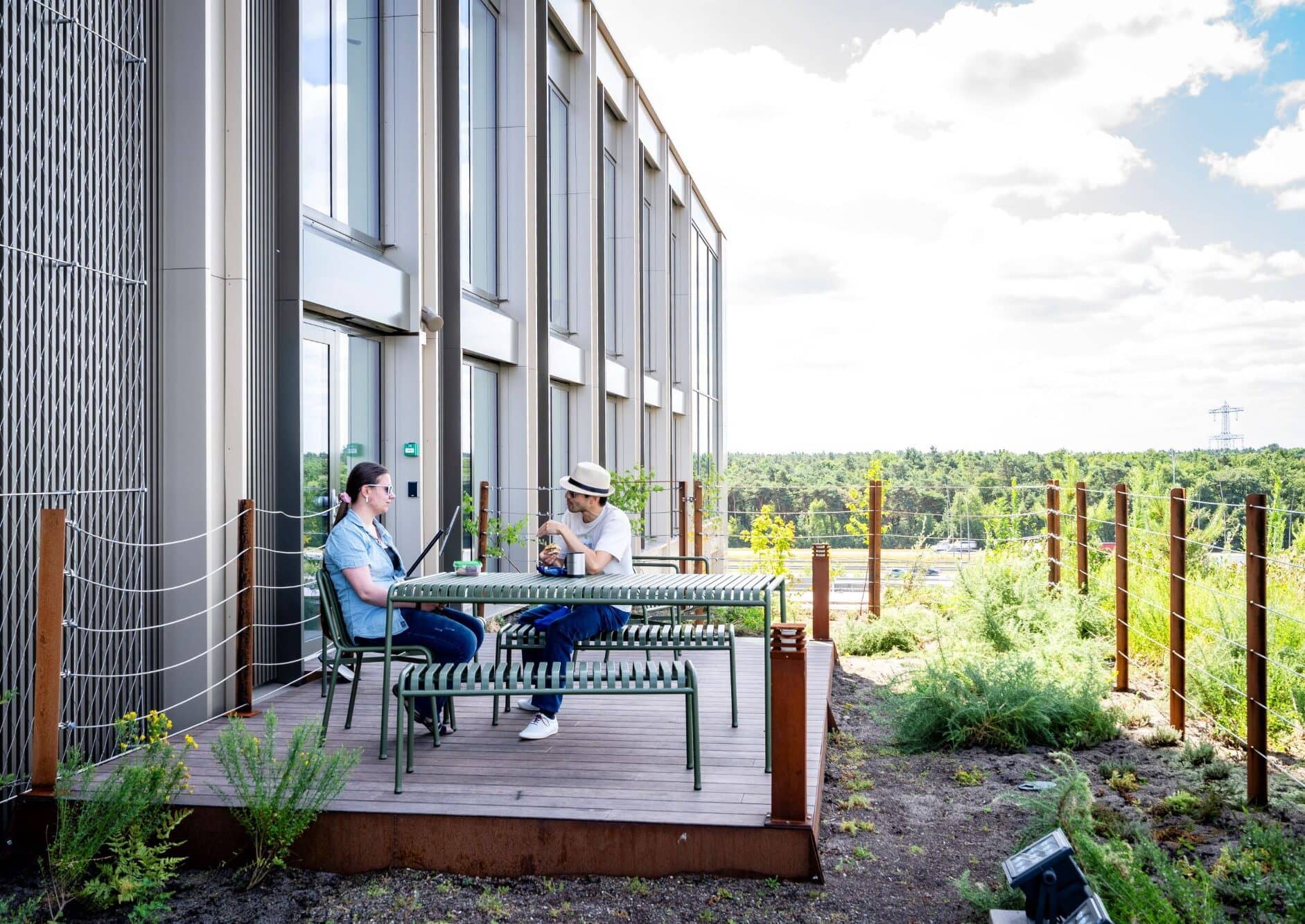 Gardens adorning the façades and roof harmonize with the natural surroundings. Vegetation climbs the exterior walls at various points, seamlessly embedding Lucis One into the landscape. In the lower levels, you find yourself working amidst the campus’s trees, while the upper floors afford expansive views of the surrounding countryside.