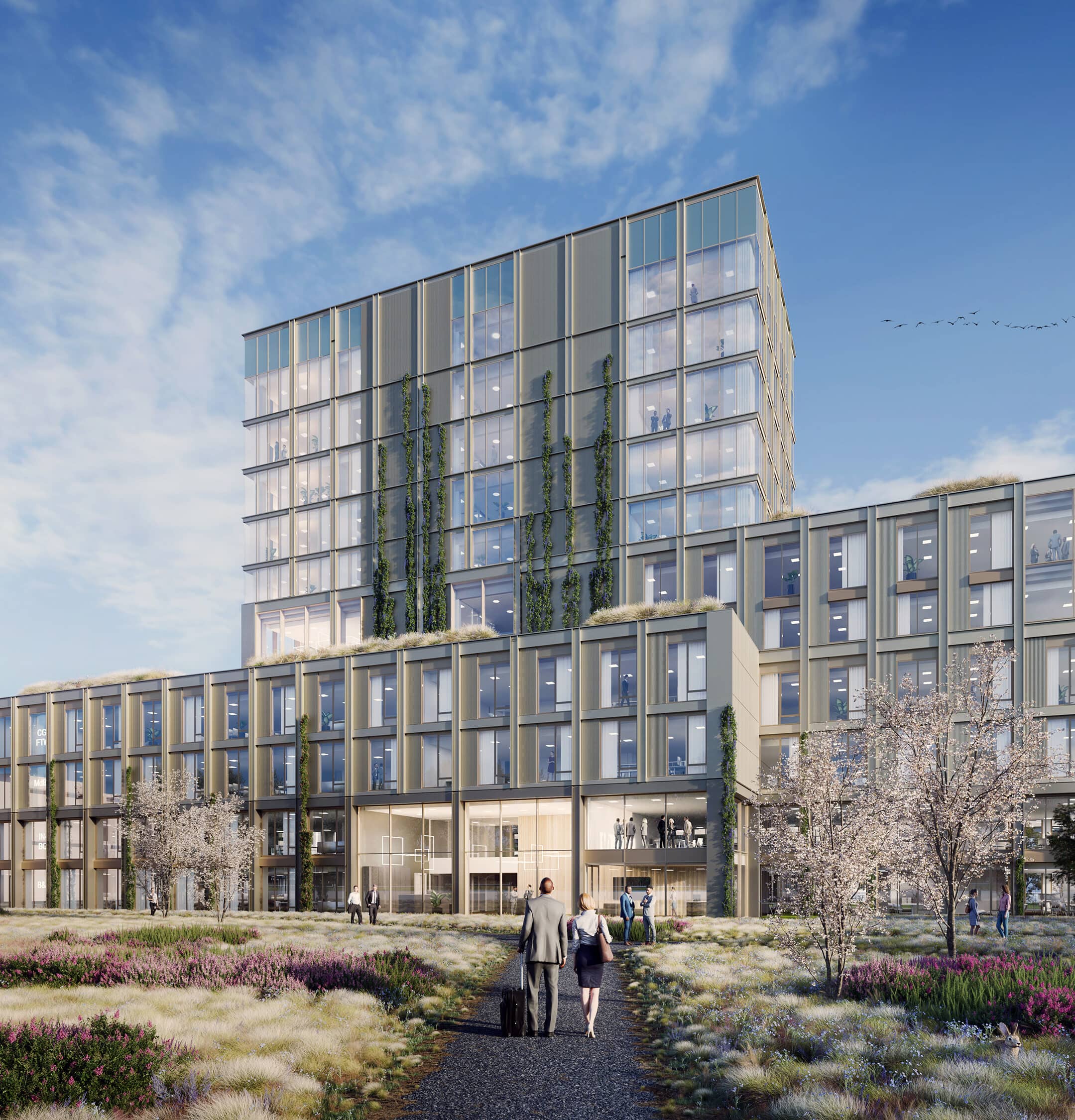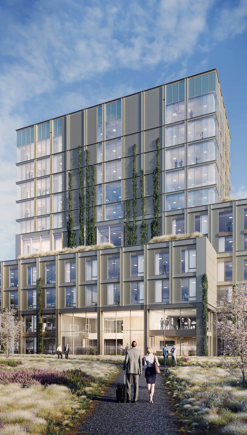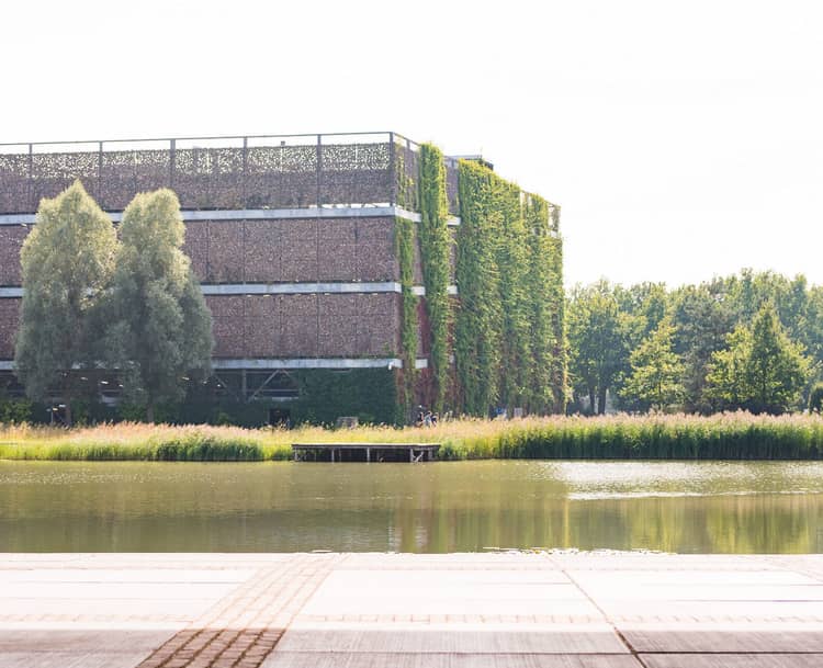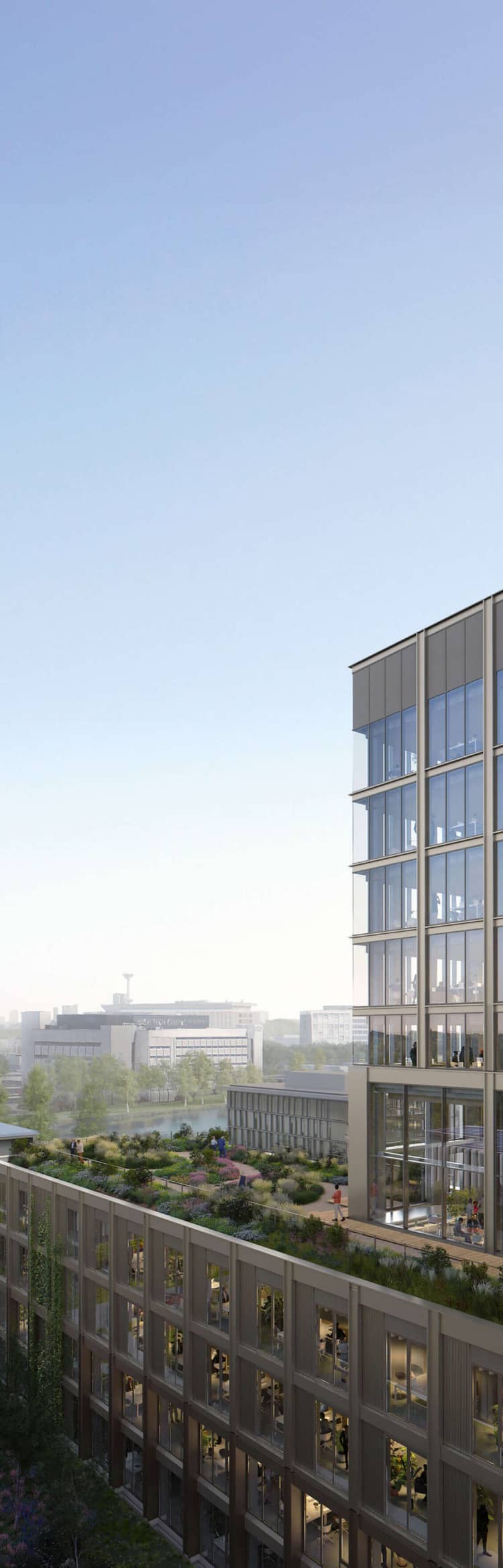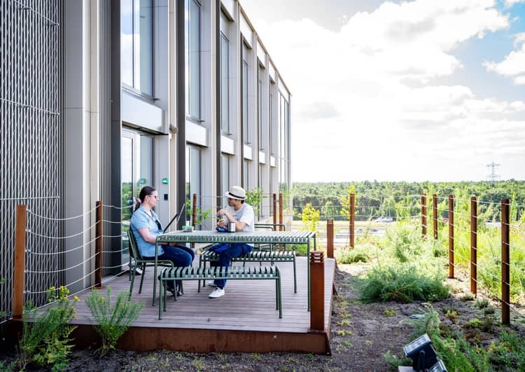 Tuinen op de gevels en het dak sluiten aan bij de natuurlijke omgeving. Op verschillende plekken groeit het groen tegen de gevels omhoog, zodat Lucis One een volwaardig onderdeel van het landschap wordt. In het lagere gedeelte werk je tussen de bomen op de Campus, de hogere verdiepingen geven uitzicht op het omringende landschap.