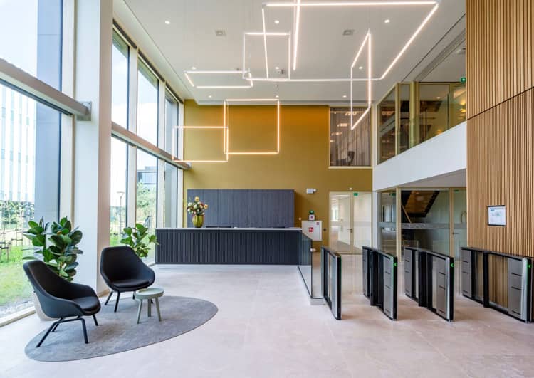 De entree van Lucis One is een warm welkom voor gasten en medewerkers. Centraal in de hal komen toegangspoorten met badgecontrole. Gasten en medewerkers kunnen soepel doorlopen terwijl ongewenste bezoekers buiten de deur blijven.